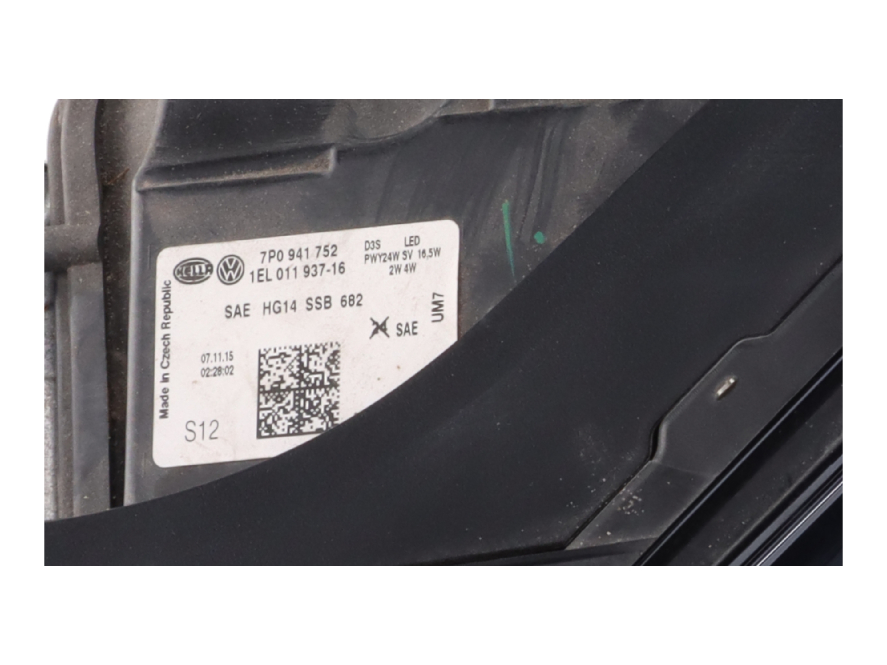 0F5 - Kraftstoffsystem Diesel : 0JB - Gewichtsklasse Vorderachse Gewichtsbereich 2 : 0K0 - Ohne alternativ-Antriebssystem : 0KA - Ohne Aufkleber und Embleme : 0M1 - Kraftstoffbehälter : 0NB - Schriftzugsatz in Grundausführung : 0P3 - Sportendrohr aus poliertem Edelstahl : 0SC - Aufkleber/Schilder in englisch : 0TD - Fussmatten vorn und hinten : 0VM - Bordliteratur englisch amerikan. : 0Y3 - Kältezonen : 0YB - Gewichtsbereich 2 nur Einbausteuerung keine Bedarfsprognose : 1AT - Elektronisches Stabilisierungsprogramm (ESP) : 1BW - Komfortfahrwerk 2 : 1D6 - Anhängevorrichtung : 1E9 - ohne Aktivkohlebehälter mit SCR : 1EB - ohne Typschild : 1G1 - Reserverad platzsparend : 1KQ - Scheibenbremsen hinten : 1L1 - Luftfilter für staubreiche Länder : 1LE - Scheibenbremsen vorn : 1MR - Lederlenkrad : 1N3 - Servolenkung geschwindigkeitsabhängig (Servotronic) : 1NS - Abdeckungen für Radnaben/Radschrauben : 1PF - Radschrauben Standard : 1Q3 - Tilgergewicht Lenkrad XX HZ : 1S1 - Bordwerkzeug und Wagenheber : 1SA - Ohne zus. Triebwerks-Unterschutz : 1T0 - Ohne Verbandmaterial ohne Warndreieck : 1W2 - Handschuhfach-Kühlung : 1Y0 - ohne Differenzialsperre : 1Z0 - Serienkraftstoff-Erstbefüllung : 2A0 - Ohne Überführungsausrüstung : 2C5 - Lenksäule axial u.vertikal einstellbar : 2G0 - Ohne Einsatz für Betankung : 2JC - Stoßfänger Komfort : 2P2 - Ladekantenschutz in Edelstahl : 2WA - ohne zusätzliche Bereifung : 3CA - ohne Trennwand : 3D1 - Mittelkonsole : 3FA - Ohne Dacheinsatz (Volldach) : 3GL - Zus. Unterteil für angehobenen Gepäckraumboden : 3L5 - Sitzeinstellung elektrisch für beide Vordersitze : 3M0 - Ohne Sonder-Maßnahmen : 3NW - Rücksitzbank-/lehne geteilt umlegbar mit Mittelarmlehne : 3S1 - Dachreling blank : 3U4 - Gepäckraumabdeckung : 3W4 - Akustik-Paket Standard : 3Y0 - ohne Sonnenschutzrollo : 3ZD - Dreip.Automaticgurte hinten außen mit US-Label : 4A3 - Sitzheizung für Vordersitze getrennt regelbar : 4AP - Tür und Seitenverkleidung : 4D0 - Ohne Sitzbelüftung/Massagesitze : 4E6 - Komfortöffnung Heckklappe (Virtuelles Pedal) : 4F6 - Zentralverriegelung "Keyless-Entry" ohne Safesicherung (NAR) : 4GF - Frontscheibe Wärmeschutzglas : 4H5 - Kindersicherung elektrisch betätigt : 4KF - Scheiben seitlich in Wärmeschutzver- glasung ab B-Säule und : hinten dunkel : eingefärbt : 4L6 - Sicherheitsinnenspiegel automatisch abblendbar : 4M3 - Becherhalter : 4QR - Dreip.-Automatikg. vorn mit Gurtstaffer mit Höheneinstellung US- : Label : 4UM - Airbag für Fahrer und Beifahrer (NAR) mit Beifahrer-Airbag- : Deaktivierung : (zweistufig) : 4X3 - Seitenairbag vorn mit Kopfairbag : 5C1 - Karosseriemaßnahmen für erhöhte Sicher- heitsanforderungen : 5D2 - Trägerfrequenz 315 MHz : 5K4 - Transportschutzhaube (Konfektionssystem) mit : zus.Transportschutzmaßnahmen : 5MA - Dekor-Einlagen : 5RR - Außenspiegel rechts konvex (US) : 5SG - Außenspiegel links plan : 5XX - Sonnenblenden mit Spiegel beleuchtet ( NAR ) : 5ZF - Kopfstützen vorn : 6A0 - ohne Feuerlöscher : 6D1 - Mittelarmlehne hinten : 6E1 - Mittelarmlehne vorn : 6EA - Ohne zus. Karosserieabdeckungen seitlich (Steinschlagschutz) : 6F0 - Ohne Dekorfolien/Embleme : 6GA - ohne Anbausatz : 6KA - Kühlerschutzgitter : 6M0 - Ohne Gepäck-Spinne/Netz/Tasche : 6NJ - Formhimmel Standard : 6P2 - Kennzeichenträger hinten (NAR) : 6Q2 - Schalthebelknopf/-Griff in Leder : 6SF - Gepäckraumbodenbelag Standard : 6W3 - Kennzeichenträger vorn (klein-NAR) : 6X0 - Ohne Haltegriff für Einstieg : 6XC - Außenspiegel elektr.einstellbar : 7A0 - Ohne CD-Wechsler/CD-Player : 7AJ - Wegfahrsperre elektronisch mit Diebstahlalarmanlage und Back- : up-Horn : 7B3 - 12 Volt-Steckdose(n) : 7E6 - Elektrische Luftzusatzheizung : 7G0 - ohne Vorbereitung für VTS (Vehicle-Tracing System) : 7GB - Abgaskonzept ULEV 2 : 7K3 - Reifendruckkontrolle Frequenz 433 MHz High : 7KJ - Fahrzeugklassen-Differenzierung -7P0- : 7L7 - Rekuperation mit 12 5 V : 7M0 - Einstiegleisten in den Türausschnitten aus Kunststoff : 7P4 - Lendenwirbelstütze manuell einstellbar in Vordersitzlehnen : 7Q8 - Navigationssystem für NAR : 7X2 - Einparkhilfe vorn und hinten : 7Y3 - Spurwechselassistent plus Spurhalteassistent : 8AY - Radio Navigationssystem : 8G0 - ohne Lichtassistent : 8IM - Gasentladungs-Scheinwerfer mit Kurvenfahrlicht : 8K9 - Tagesfahrlicht mit Assistenzfahrlicht und coming home Funktion : 8L6 - Diversity - Scheibenantenne : 8Q5 - Leuchtweitenregulierung autom/dynamisch mit Kurvenfahrlicht (AFS : 1) : 8RM - 8 Lautsprecher ( passiv ) : 8SL - SBBR-Leuchte in LED-Technik (NAR) : 8T3 - Automatische Distanzregelung : 8TA - ohne Nebelschlussleuchte : 8WH - Nebelscheinwerfer und Abbiegeleuchte : 8X0 - Ohne Scheinwerferreinigungsanlage : 8Y1 - Doppelton-Signalhorn : 8Z6 - Heissland : 9AD - Climatronic FCKW-frei : 9G1 - Drehstromgenerator 220 A : 9JF - Nichtraucherausführung (NAR) : 9M0 - Ohne Zusatz-/Standheizung : 9MA - Innenbeleuchtung in Grundausstattung : 9NX - Ohne elektronisches Fahrtenbuch : 9P7 - Gurtkontrolle opt.u.akust. E-Kontakt im Gurtschloss : 9Q2 - Multifunktionsanzeige/Bordcomputer mit Check Control : 9T1 - Scheibenwaschdüsen beheizbar vorn : 9TG - Zus.Warnleuchten (Türbereich) vorn : 9WC - Ohne Multimedia" im Fahrzeug : 9Z2 - Betriebsspannung 12 V plus 115V Wechselrichter : 9ZF - Telefonvorbereitung für Handy mit Freisprechanlage : A8B - Grundausstattung : AV2 - Rechtsverkehr (NAR) : B0D - Bauteilesatz -USA entsprechender Fahr- zeugausführung(ohne : Kalifornien) div.T. : BU2 - Gesetzlich Anforderungen USA 2 Bundesstaaten mit CARB- : Forderung : C0J - Leichtmetallräder 8J x 18 : C12 - Betriebserlaubnis Nachtrag : D50 6-Zyl.Turbodieselmotor 3 0 L/176 KW(24V) V6 TDI Common-Rail : Grundmotor : ist : T41/TE1/TF1/TH1 E0A - keine Aktionsausführung : EA0 - Ohne Anschlussgarantie : EL0 - ohne Online Dienst : EM0 - Ohne Müdigkeitserkennung : FB0 - Normal-Lackierung : FC0 - Ohne Individualeinbau : FE0 - Ohne Ländercode (kein DVD-Player im FZG) : FM0 - Variante Grunda