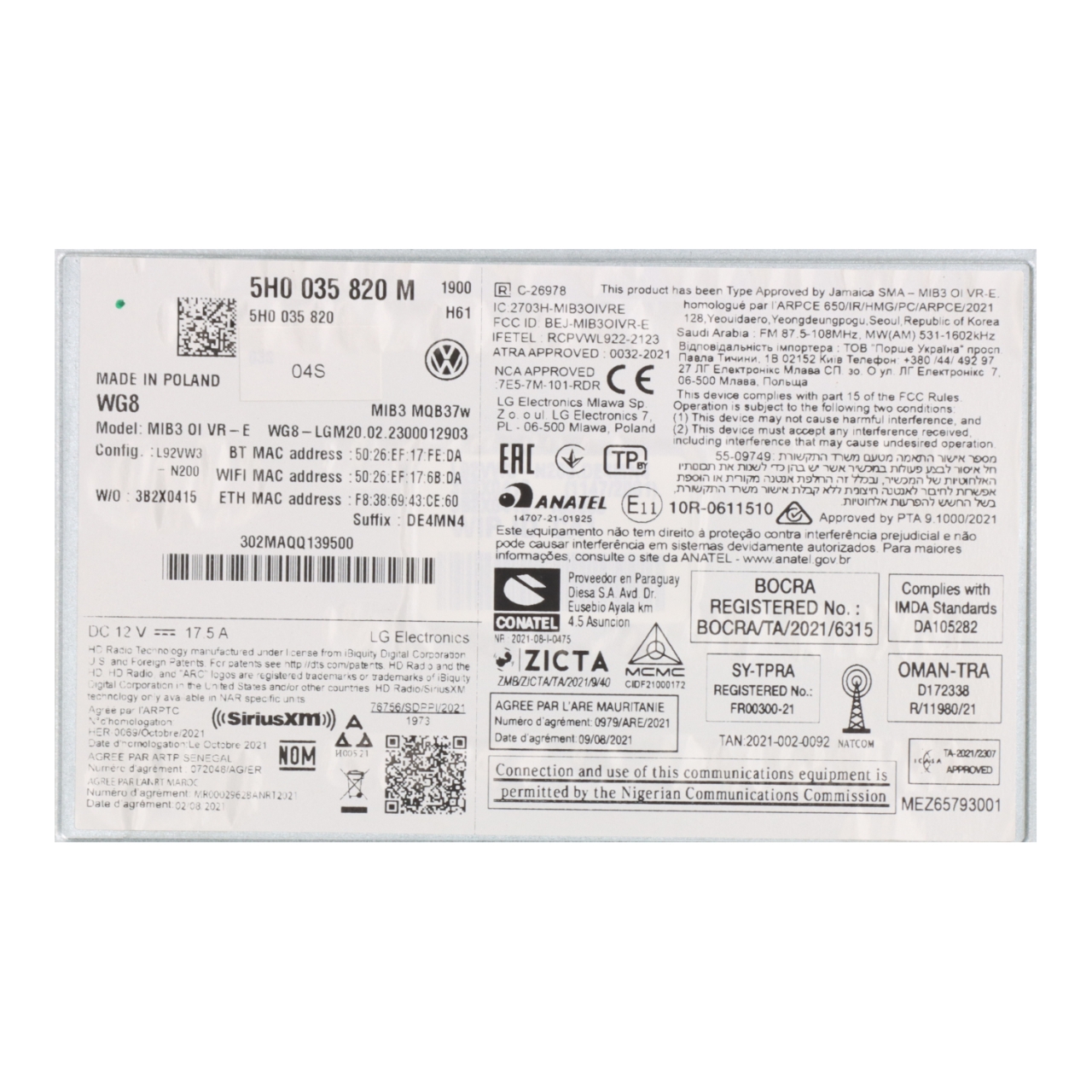 01D - Zul. Gesamtgewicht : 02A - Radstand : 0D1 - Fahrerhaustüren : 0ED - Einbau Differenzierung für Getriebe "MQ 281" -- Fahrzeugteile -- : 0K0 - Ohne alternativ-Antriebssystem : 0NB - Schriftzugsatz in Grundausführung : 0TD - Fußmatten vorn und hinten : 0VC - Bordliteratur in Deutsch : 0Y1 - Standard-Klimazonen : 0YA - Gewichtsbereich 1 nur Einbausteuerung keine Bedarfsprognose : 0Z0 - -VW-Marken-/Klassen spezifische Merkmale : 1A5 - Kraftstoffsystem Otto-Einspritzer : 1AQ - BRS für Fahrzeuge ohne E-Antrieb (ESC und eBKV) : 1D0 - Ohne Anhängevorrichtung : 1E5 - Aktivkohlebehälter (EVAP) : 1EX - Spezielles Typschild für EG für M1-Pkw : 1G8 - Pannen-Set : 1HZ - Hinweisschilder ohne Ländergruppe : 1JA - Dämpfung hinten Basis 1 : 1KE - Scheibenbremsen hinten : 1N3 - Servolenkung geschwindigkeitsabhängig (Servotronic) : 1NL - Abdeckungen für Leichtmetallräder : 1PA - Radschrauben Standard : 1SA - Ohne zus. Triebwerks-Unterschutz : 1T9 - Verbandmaterial mit Warndreieck und Warnweste : 1U9 - Klapptisch an Vordersitzlehnen : 1X0 - Frontantrieb : 1Z0 - Serienkraftstoff-Erstbefüllung : 1ZD - Scheibenbremsen vorn (Geomet D) : 2DL - Fahrzeugklassen-Differenzierung -2KA- : 2FB - Multifunktionslenkrad : 2H0 - Ohne "drive select" : 2J1 - Stoßfänger Komfort : 2P0 - Ohne Ladekantenschutz : 2WA - Ohne zusätzliche Bereifung : 3A0 - Kindersitzverankerung für Kindersitzsystem I-Size 2 x top tether : 3D7 - Mittelkonsole : 3FA - Ohne Dacheinsatz (Volldach) : 3H2 - Lehnenentriegelung für rechten Vorder- sitz : 3JA - Ohne Dacheinsatz im Lade-/Fahrgastraum : 3L3 - Höheneinstellung manuell für Vordersitze : 3LE - Tür und Seitenverkleidung : 3NM - Rücksitzbank/-lehne geteilt umlegbar : 3RC - Heckklappe mit Fensterausschnitt : 3S2 - Dachreling schwarz : 3U2 - Gepäckraumabdeckung schiebbar : 3W0 - Ohne zus. Geräuschdämpfungsmaßnahmen für Innenraum : 3ZU - Dreip.Automatikgurte hinten außen mit ECE-Label : 41Q - Leichtmetallräder 6 1/2J x 16 : 4A3 - Sitzheizung für Vordersitze getrennt regelbar : 4BI - Abgaskonzept EU6 AP : 4DE - Seitenfenster fest im Fahrgastraum vorn links : 4EE - Seitenfenster fest im Fahrgastraum vorn rechts : 4FH - Seitenfenster fest im Lade-/Fahrgastraum links : 4G3 - Mit Ausweichunterstützung mit Abbiegeassistent : 4GF - Frontscheibe Wärmeschutzglas : 4H5 - Kindersicherung elektrisch betätigt : 4HH - Heckfenster beheizbar : 4I2 - Zentralverriegelung m. Funkfernbedienung Innenbetätigung ohne Safesicherung : 4JH - Seitenfenster fest im Lade-/Fahrgastraum rechts : 4L2 - Sicherheitsinnenspiegel abblendbar : 4QT - Dreip.Automatikgurte vo.m.Gurtstraffer und Höheneinstellung : 4S0 - Ohne Armlehnen f.Vordersitze : 4U0 - Ohne Gepäck-Netze/Taschen an Rückenlehnen : 4UF - Airbag FS und BFS ohne Knieairbag mit BFS-Deaktivierung : 4Z8 - Handschuhfachklappe mit Leuchte (ohne Schließzylinder) : 51A - Ohne Folienbeklebung : 5AD - Teppichbodenbelag im Fahrerhaus : 5BF - Teppichbodenbelag im Fahrgastraum : 5DD - Seitenverkleidung Komfort im Fahrgastraum : 5EW - Zulassung als PKW : 5F1 - UWB fähiges Land und Trägerfrequenz 433 92 bis 434 42Mhz : 5K7 - Transportschutzfolie (Mindestschutz) mit zus. : Transportschutzmaßnahmen : 5Q2 - Schiebetür links im Lade-/Fahrgastraum : 5R2 - Schiebetür rechts im Lade-/Fahrgastraum : 5WH - Nachträglicher Einbau Netztrennwand C-Säule : 5XR - Sonnenblenden mit Spiegel Airbag-Label auf Beifahrersonnenblende : 6A0 - ohne Feuerlöscher : 6C6 - Seitenairbag vorn plus Kopfairbag vorn und hinten und Interaktionsairbag vorn : 6EA - Ohne zus. Karosserieabdeckungen seitlich (Steinschlagschutz) : 6FK - Anbauteile in Wagenfarbe : 6I1 - Spurhalteassistent : 6LH - Ausströmer Komfort : 6Q1 - Schalthebelknopf/-Griff in Kunststoff : 6SF - Gepäckraumbodenbelag Standard : 6U1 - Zus. Staubschutz-Dichtung außen : 6XP - Außenspiegel elektrisch anklappbar elektrisch einstellbar separat beheizbar : 7AA - Wegfahrsperre elektronisch : 7B2 - 12 Volt-Steckdose im Kofferraum : 7E0 - Ohne Wärmespeicher/Zusatzheizung : 7K1 - Reifendruckkontrolle : 7L6 - Start/Stopp-Anlage mit Rekuperation : 7M5 - Ohne Trittschutzfolie für Türeinstieg : 7N1 - Ablageschale am Dachhimmel : 7P4 - Lendenwirbelstütze manuell einstellbar in Vordersitzlehnen : 7TC - Dekor-Einlagen : 7UJ - Vorbereitung für Navigationssystem mit Media und Internet Paket : 7X2 - Einparkhilfe vorn und hinten : 7Y0 - Ohne Spurwechselassistent : 8AR - Optionsinfotainment (MIB3) : 8FA - Ohne 2. Batterie : 8G0 - Ohne Lichtassistent : 8GU - Drehstromgenerator 140 A : 8ID - Halogen-Doppelscheinwerfer : 8J3 - Front Assist mit Warnen und Bremsen auf Fahrzeuge Fußgänger und Radfahrer : 8M1 - Heckscheiben-Wisch-Waschanlage mit Intervallschaltung : 8N8 - Scheibenwischer-Intervallschaltung mit Lichtsensor : 8Q1 - Leuchtweitenregulierung : 8QJ - Schlüssel für Schließsystem mit Fernbedienung : 8RL - 6 Lautsprecher (passiv) : 8SA - SBBR-Leuchten Normalausführung : 8T6 - Geschwindigkeitsregelanlage plus Speed-Limiter : 8U0 - Ohne Zusatzgeräte Wegstreckenmessung : 8WA - Ohne Nebelscheinwerfer : 8X7 - Ohne Scheinwerferreinigungsanlage mit Waschwasser- Standanzeige : 8Z5 - Nicht Heissland : 9A0 - Ohne Taxi Alarmanlage : 9AK - Climatronic mit Stauluftregelung FCKW-frei : 9C7 - Tagesfahrlichtschaltung mit Assistenzfahrlicht : 9CW - LED-Innenleuchtenkonzept im Fahrgast-/Laderaum : 9D0 - ohne Vorbereitung Einbau Funkgerät : 9JA - Nichtraucherausführung : 9KA - Ohne Erkennungsleuchten : 9M0 - Ohne Zusatz-/Standheizung : 9P4 - Gurtkontrolle E-Kontakt vorn und hinten optisch und akustisch : 9S5 - Multifunktionsanzeige/Bordcomputer "Medium" : 9T1 - Scheibenwaschdüsen beheizbar vorn : 9WJ - Wired & Wireless App-Connect : 9Z0 - Betriebsspannung 12 V : 9ZX - Telefonvorbereitung für Handy : A8G - Sport-Komfortausstattung : AV1 - Rechtsverkehr : B01 - Typprüfland Deutschland : B0A - Bauteilesatz ohne länderspezifische Bauvorschrift : C10 - Betriebserlaubnis Nachtrag : E0A - Keine Aktionsausführung : EL5 - Online-Dien