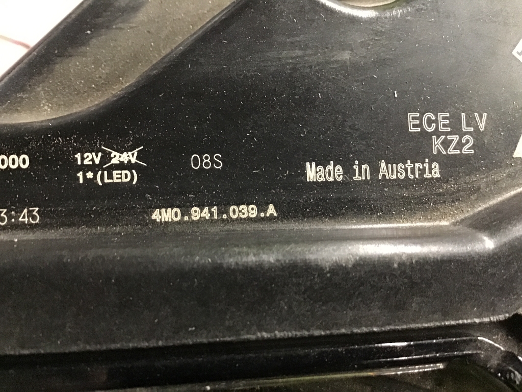 04A-Basis : 0E2-Langer Radstand : 0F3-Kraftstoffsystem Diesel : 0FA-Fertigungsablauf Standard : 0JK-Gewichtsklasse Vorderachse Gewichtsbereich 10 : 0K4-Hybrid-Antriebssystem M-HEV : 0LH-Mit spez.Schilder/Aufkleber Sicherheitszertifikate f. Australien : 0M5-Kraftstoffbehälter : 0N1-Hinterachse "Standard" : 0NA-Ohne Schriftzugsatz (ohne Typbezeichnung) : 0P0-Abgasendrohr hinten (Standard) : 0RZ-Ohne Zündanlaß-Schloß-Sperrsystem ohne Lenkungssperre : 0TD-Fußmatten vorn und hinten : 0VF-Bordliteratur in englisch : 0Y2-Tropische Zonen : 0YJ-Gewichtsbereich 9 nur Einbausteuerung keine Bedarfsprognose : 1BK-4 Corner Luftfederung mit elektrisch geregelter Dämpfung : 1D8-Vorbereitung für Anhängevorrichtung : 1EY-Spezielles Typschild mit Gewichtsangabe aber ohne ABE ( RdW ) : 1G8-Pannen-Set : 1KU-Scheibenbremsen hinten : 1LP-Scheibenbremsen vorn : 1P0-Federung Standard : 1PR-Radschrauben mit Diebstahlsicherung plus Radlöseerkennung : 1S2-Bordwerkzeug : 1SA-Ohne zus. Triebwerks-Unterschutz : 1T3-Verbandmaterial mit Warndreieck : 1VH-Einbauteile f.6 Zyl.Motor : 1XW Ledersportmultifunktionslenkrad : 1Y6-Automatisches Sperrdifferenzial : 1Z5-Erhöh.der Serienkraftstofferstbefüllung : 20A-Ohne Elektromotor ( Hybrid ) : 2C5 Lenksäule axial u.vertikal einstellbar : 2D0-Ohne CW-Wert Verkleidung : 2F0-Ohne Systeme für den Fahrzeugzugang : 2G5-Einfüllstutzen-Modul 1 ohne Einsatz : 2H1-"drive select" : 2K1-Stoßfänger verstärkt : 2KR Aufkleber/Schilder englisch-deutsch : 2P2-Ladekantenschutz in Edelstahl : 2V5-Frischluftansaugung mit Aktivkohlefilter : 2WA-Ohne zusätzliche Bereifung : 2Z8-Typzeichen und Firmenemblem : 3B5-Kindersitzverankerung für Kindersitzsystem ISO FIX : 3CX-Netztrennwand : 3FA-Ohne Dacheinsatz (Volldach) : 3G0-Ohne Kindersitzverankerung vorn (ISOFIX) : 3GD-Ebener Ladeboden hinten : 3L4-Sitzeinstellung elektrisch für beide Vordersitze Fahrersitz mit Memory : 3M3-PKW-Ausführung : 3S2-Dachreling schwarz : 3U7-Gepäckraumabdeckung : 3Y0-Ohne Sonnenschutzrollo : 42P-Leichtmetallräder 9 1/2J x 21 : 4A3-Sitzheizung für Vordersitze getrennt regelbar : 4BF-Abgaskonzept EU6 DG : 4D0-Ohne Sitzbelüftung/Massagesitze : 4E7-Servoschließung Heckklappe : 4GF-Frontscheibe Wärmeschutzglas : 4I3-Zentralverriegelung "Keyless-Entry" ohne Safesicherung : 4KC-Scheiben seitlich und hinten in Wärmeschutzverglasung : 4L6-Sicherheitsinnenspiegel automatisch abblendbar : 4UE-Airbag FS und BFS ohne Knieairbag ohne BFS-Deaktivierung : 4X4-Seitenairbag vorn und hinten mit Kopfairbag : 4ZD-Zierleisten schwarz : 5C0-ohne besondere Karosseriemassnahmen : 5D1-Trägerfrequenz 433 92 bis 434 42 MHz : 5J1-Heckspoiler : 5K5-Transportschutzfolie mit zusätzlichen Transportschutzmaßnahmen : 5KL-5 Hintersitze (mit Armlehne) : 5L0-ohne Frontspoiler : 5MA-Dekor-Einlagen : 5SJ-Außenspiegel links konvex : 5XL-Sonnenblenden mit Make-up-Spiegel beleuchtet auf Fahrer und Beifahrerseite : 5ZC-Kopfstützen für Vordersitze (X-Verstellung) : 6A0-ohne Feuerlöscher : 6E6-Mittelarmlehne vorn : 6F0-Ohne Dekorfolien/Embleme : 6FJ-Außenspiegelgehäuse schwarz : 6I6-Spurhalteassistent plus Emergency Assist und Stauassistent : 6K8-pre sense city ohne pre care : 6NJ-Formhimmel Standard : 6SS-Gepäckraumbodenbelag : 6TS-Außenspiegel rechts asphärisch großes Sichtfeld : 6U7-Zus. Staubschutzmaßnahmen : 6V1-Heckblende (ECE) : 6W6-Kennzeichenträger vorn : 6XL-Außenspiegel mit Memoryfunktion automatisch abblendbar elektrisch : anklapp-/einstell-/beheizbar : 6Y2-Geschwindigkeitsbegrenzungsanlage : 73A-Ohne Ladekabel ( Industriestecker ) : 76A-Ohne Mode3 Ladekabel : 7A0-Ohne CD-Wechsler/CD-Player : 7AA-Wegfahrsperre elektronisch : 7E6-Elektrische Luftzusatzheizung : 7G0-Ohne Vorbereitung für VTS (Vehicle-Tracing System) : 7HA-Ohne Belederung : 7K9-Reifenkontrollanzeige : 7L8-Start/Stopp-Anlage mit Rekuperation : 7M1-Einstiegleisten in den Türausschnitten mit Metalleinlage : 7P1-Lendenwirbelstütze elektr. einstellbar in Vordersitzlehnen : 7UG-Navigationsgerät-High : 7W3-Mit erweitertem Sicherheitssystem (PreCrash Basic und Heck) : 7X5-Parklenkassistent : 7Y1-Spurwechselassistent : 7ZB-Fahrzeugklassen-Differenzierung -4M0- : 8G4-Matrix-Beam : 8IY-LED- Hauptscheinwerfer mit Linse : 8K4-Tagesfahrlichtschaltung -- NAR -- : 8T5-Automatische Distanzregelung : 8VM-LED-SBBR-Leuchte Fahrtrichtungsanzeiger animiert : 8X0-Ohne Scheinwerferreinigungsanlage : 8Y1-Doppelton-Signalhorn : 8Z4-Gemässigtes Heissland : 9AE-Climatronic vorn und mehrzoniger Fondraumbedienung : 9B0-Ohne integriertes Mautsystem : 9G8-Riemenstartergenerator RSG 48V 110-250 A : 9JA-Nichtraucherausführung : 9M0 Ohne Zusatz-/Standheizung : 9P6-Gurtkontrolle E-Kontakt im Gurtschloss : 9PA-Scheibenwischerarme-/Blätter Standard : 9R0-Ohne Nachtsichtsystem : 9S9-Multifunktionsanzeige/Bordcomputer "FPK" Skinning : 9TA-Ohne zus.Warnleuchten : 9VS-Soundpaket "branded" : 9WC-Ohne Multimedia" im Fahrzeug : 9ZX-Telefonvorbereitung für Handy : A00-Kein Selbstabholer : A51-Audi AG : A9F-Ausstattung 1 : AQ0-Serienqualität : AV0-Linksverkehr : B0R Bauteilesatz -Australien entsprechender Fahrzeugausführung diverse Teile : B30-Typprüfland Australien : C57-Betriebserlaubnis Nachtrag : D4Z-6-Zyl.Turbodieselmotor 3 0 L/170 KW V6 TDI Common-Rail Grundmotor ist : T7V E0A-Keine Aktionsausführung : EH0-Ohne Ladekabel : ER2-Regionscode " RdW " für Radio : ES0-Ohne Ladedose : EV0-Ohne Ladekabel : F0A-Kein Sonderfahrzeug Standard-Ausführung : FA0-Abwicklung Serie : FK2-Mit zus. Tank für SCR (24 Liter) : FM0-Variante Grundausstattung : FP0-FOD Funktionen nicht verfügbar : FQ0-Räder der Serie : FT3-Intelligenter Parkassistent : FY0-. : FZ1-N.N.N. Ausführung 1 : G1G-8-Gang-Automatikgetriebe für Allrad : GA0-Ohne Vorkonditionierung : GB0-Ohne Kompensor : GH1-Hinterachsgetriebe Basis : GJ0-Ohne kombinierte Längs- und Querführung : GM0-Ohne Außen-Sound Maßnahmen : GP1-Fahrzeuge mit besonderen Produktaufwer- tungsmaßnahmen : GS0-ohne Applikationen : GZ0-Manuell betätigte T